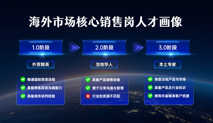 在进入海外深度布局阶段后,企业通常会在目标市场优先考虑具备产品销售经验的当地华人,以便中方的日常沟通与管理执行。然而,多家客户企业的实践证明,这类人选往往存在行业经验或客户资源错配等短板,中企在短期内享受到的便利难以转化为长期市场价值,反而可能导致中企在海外市场后续开展乏力,业务停滞不前。